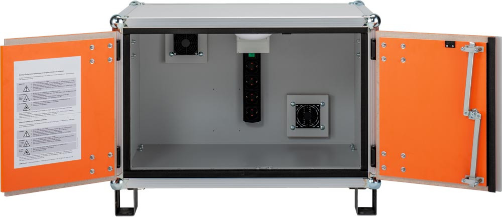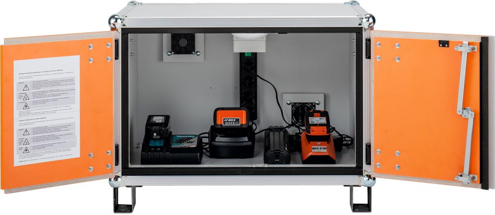 Akku-Ladeschrank, Basis, Rauchmelder, techn. Lüftung, BxTxH 800x660x620 mm, Tür orange, Stapelfüße, Korpus grau EP560640