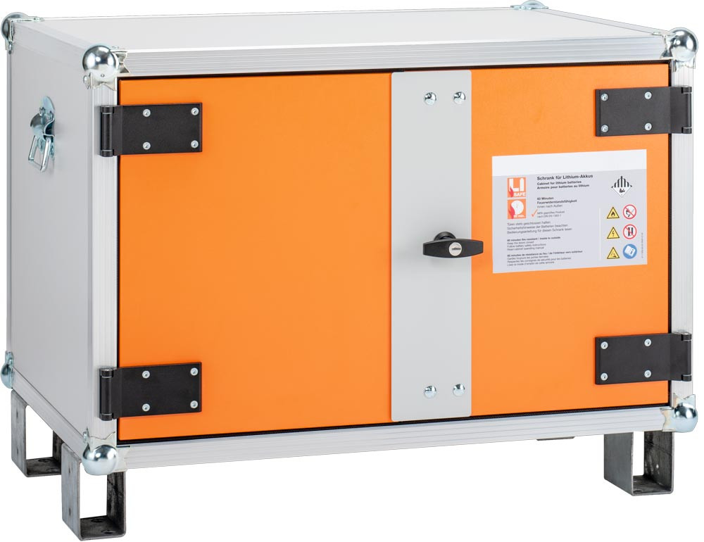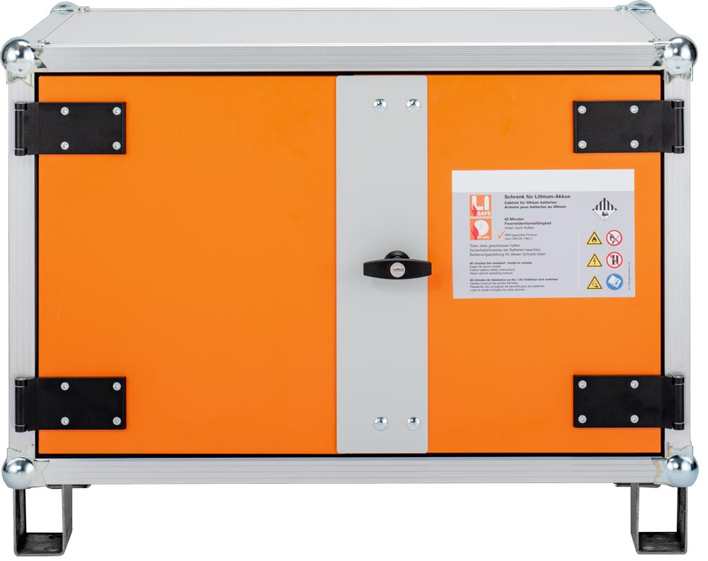 Akku-Ladeschrank, Basis, Rauchmelder, techn. Lüftung, BxTxH 800x660x620 mm, Tür orange, Stapelfüße, Korpus grau