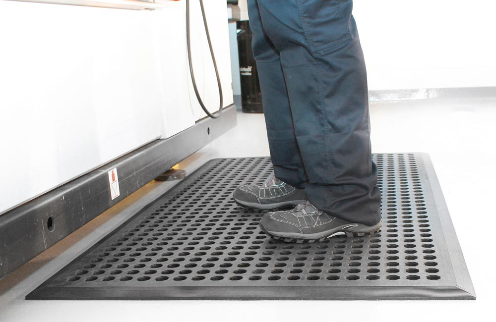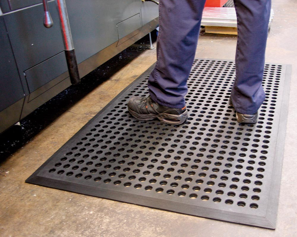 · Belastbare, ergonomische Arbeitsplatzmatte · Reduzierung der Rutschgefahr · Erhöhter Stehkomfort · Flüssigkeiten und Späne werden durch die offenen Löcher aufgefangen · Rundum abgeschrägte Kanten