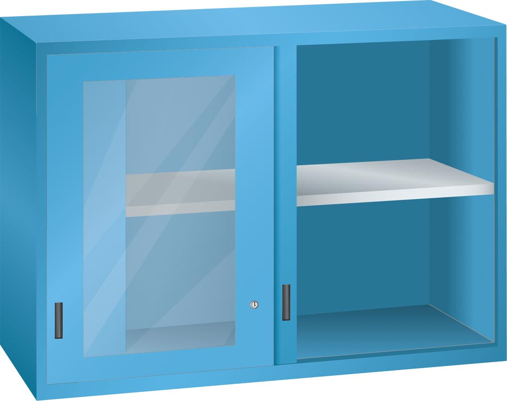 Aufsatzschrank mit Sichtfensterschiebetüren, BxTxH 1023x725x1000 mm, 1 Verstellboden, RAL 5012, passend zu Schubladenschrank 54x36 E EP531369