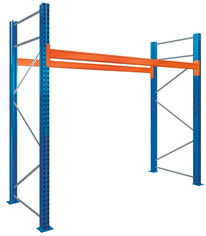 · Zur Lagerung von Paletten · Bock-Anbauregale dürfen ausschließlich in Kombination mit Bock-Grundregalen verwendet werden · 1 Holmebene · Rahmen blau, Holme orange, Fachwerk verzinkt
