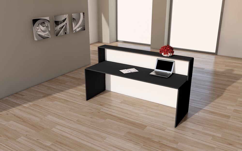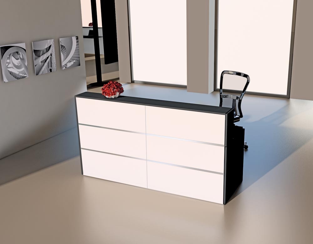 ∙ Stahl-/Holzkonstruktion ∙ Thekenkörper aus Metall in weiß mit dekorativen Edelstahlstreifen ∙ Melaminharzbeschichtete Holzplatten mit ABS-Kante in anthrazit ∙ Kabeldurchlässe in der Arbeitsplatte ∙ Hinter den 1100 mm hohen Fronten befindet sich ein vollwertiger Arbeitsplatz mit einer Tiefe von 800 mm und einer Höhe von 740 mm ∙ Beliebig erweiterbar durch Anbauelement