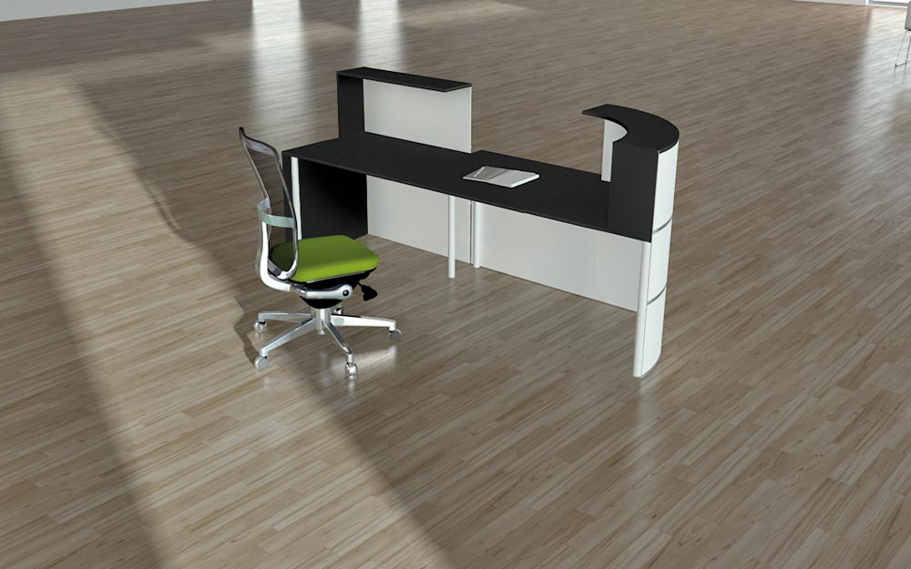 ∙ Stahl-/Holzkonstruktion ∙ Thekenkörper aus Metall in weiß mit dekorativen Edelstahlstreifen ∙ Melaminharzbeschichtete Holzplatten mit ABS-Kante in anthrazit ∙ Kabeldurchlässe in der Arbeitsplatte ∙ Hinter den 1100 mm hohen Fronten befindet sich ein vollwertiger Arbeitsplatz mit einer Tiefe von 800 mm und einer Höhe von 740 mm ∙ Beliebig erweiterbar durch Anbauelement