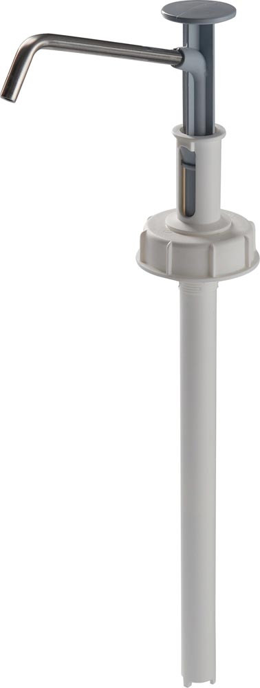 Auslaufrohr aus Edelstahl, Pumpe aus Edelstahl und Kunststoff · Drucktaste aus Kunststoff · für 10-Liter-Kanister mit 51er Gewinde · Dosiermenge: ca. 5 ml / Hub · Höhe: ca. 398 mm · Länge: ca. 174 mm · Drucktaste Ø: ca. 38 mm · Anwendung: zur Dosierung von Seifen und viskosen Flüssigkeiten mit Reibemittel