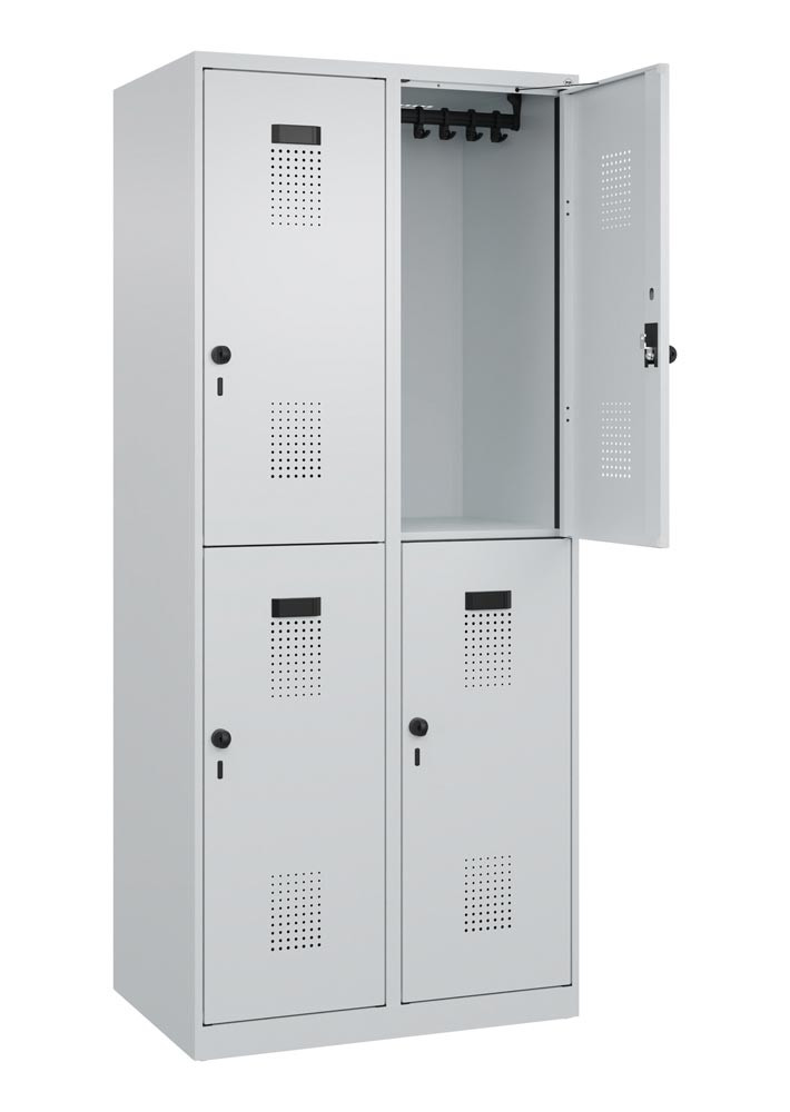 ∙ Stabile Stahlkonstruktion mit hochwertiger Einbrennbeschichtung ∙ Verstärkte Türen mit Anschlagsdämpfer für geräuscharmes Schließen ∙ Designlochbilder für optimale Belüftung ∙ Stabile Garderobenstange mit 3 verdrehsicherem Doppel-Schiebehaken ∙ Glatter Abteilboden für einfaches Auskehren ∙ Fußteil und Schrankboden serienmäßig verzinkt für erhöhten Korrisionschutz ∙ Innovative Kant- und Biege-Geometrien, sowie Materialdopplungen ∙ Fest verschweißter Ablageboden pro Abteil ∙ Optimierte Lüftungsöffnungen im Abteil · Pro Abteil 1 Ablageboden · Korpus T 500 mm