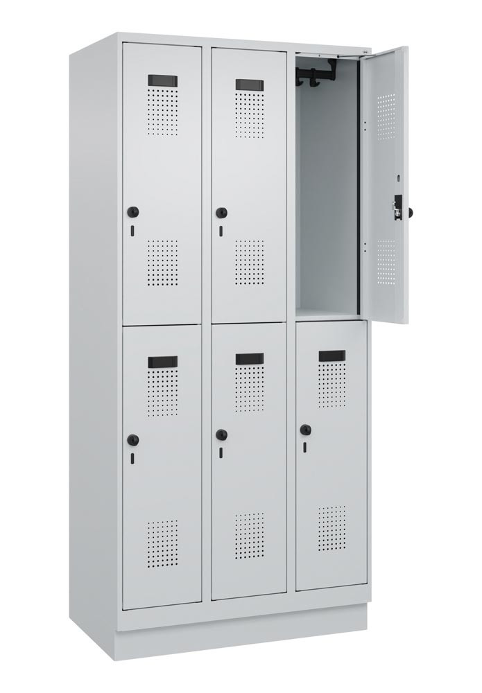 Fächerschrank, Stahl, doppelstöckig, 3x2 Fächer, Abt.B 300 mm, Sockel, Drehriegel, BxTxH 900x500x1950 mm, RAL 7035