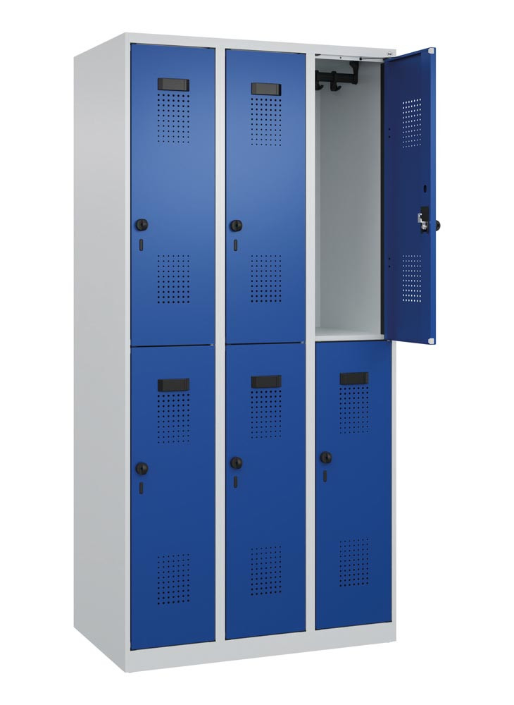 Fächerschrank, Stahl, doppelstöckig, 3x2 Fächer, Abt.B 300 mm, bodenstehend, Drehriegel, BxTxH 900x500x1850 mm, RAL 7035/5010