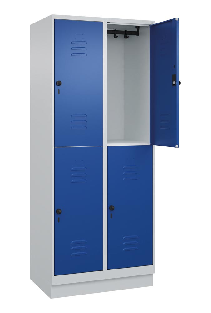 Fächerschrank, doppelstöckig, BxTxH 800x500x1950 mm, 2x2 Fächer, Abt.B 400 mm, Drehriegel, Sockel, RAL 7035/5010