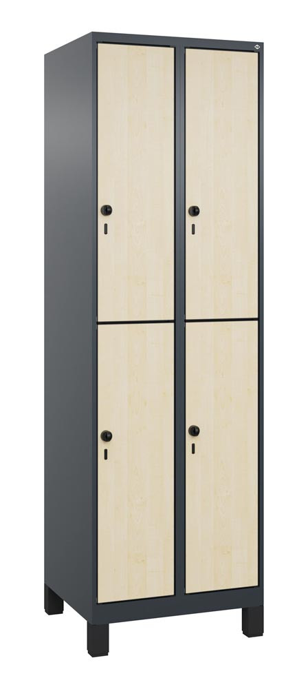 Fächerschrank, doppelstöckig, Füße, 2x2 Fächer, Abt.B 300 mm, BxTxH 600x500x1950 mm, HPL-Dekorfront, RAL 7016/Dekor Ahorn