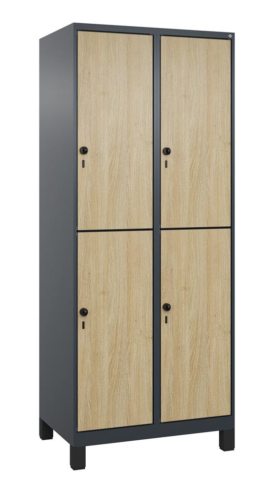 Fächerschrank, doppelstöckig, Füße, 2x2 Fächer, Abt.B 400 mm, BxTxH 800x500x1950 mm, HPL-Dekorfront, RAL 7016/Dekor Eiche Sereno