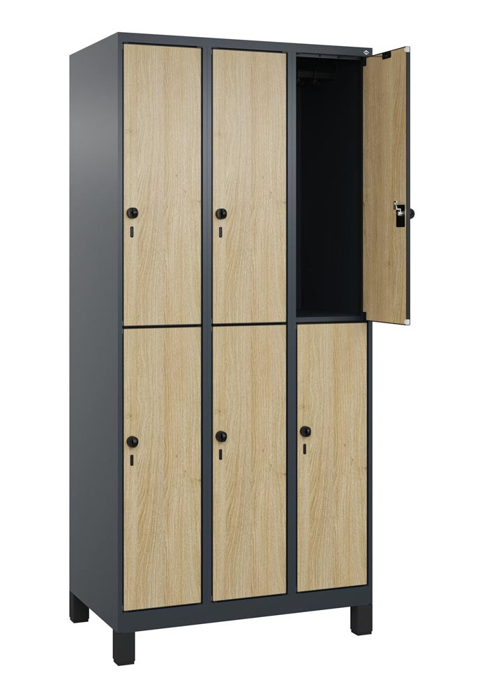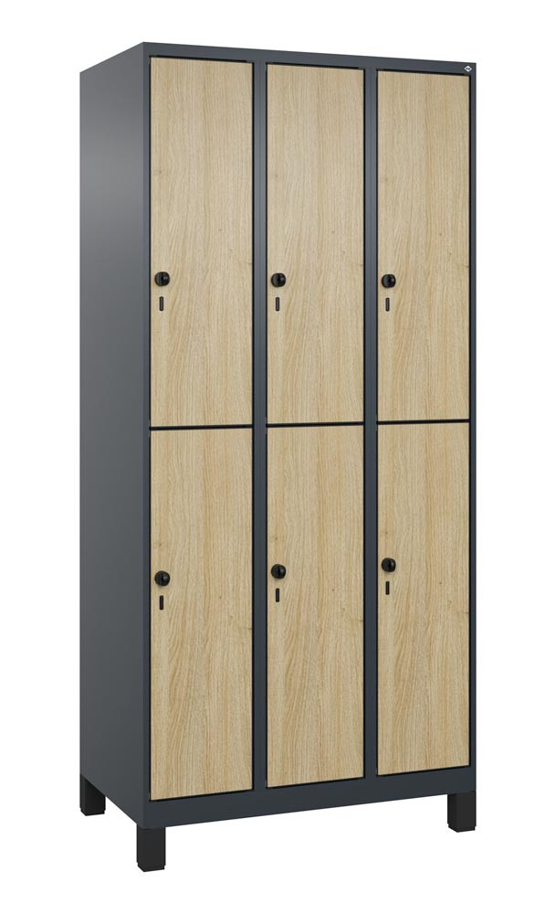 Fächerschrank, doppelstöckig, Füße, 3x2 Fächer, Abt.B 300 mm, BxTxH 900x500x1950 mm, HPL-Dekorfront, RAL 7016/Dekor Eiche Sereno