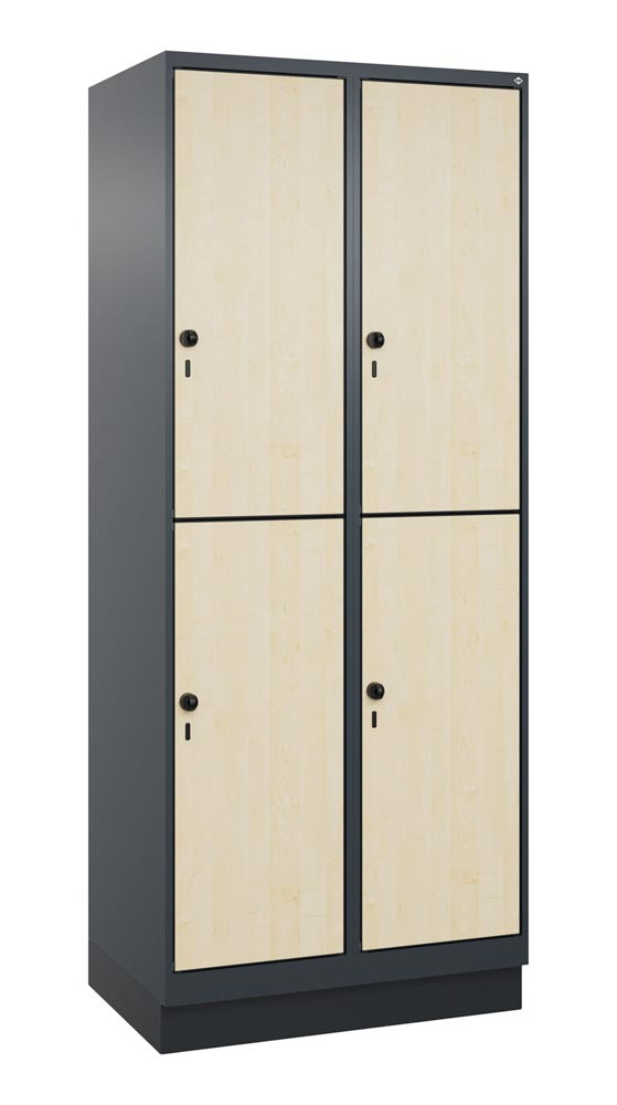 Fächerschrank, doppelstöckig, Sockel, 2x2 Fächer, Abt.B 400 mm, BxTxH 800x500x1950 mm, HPL-Dekorfront, RAL 7016/Dekor Ahorn