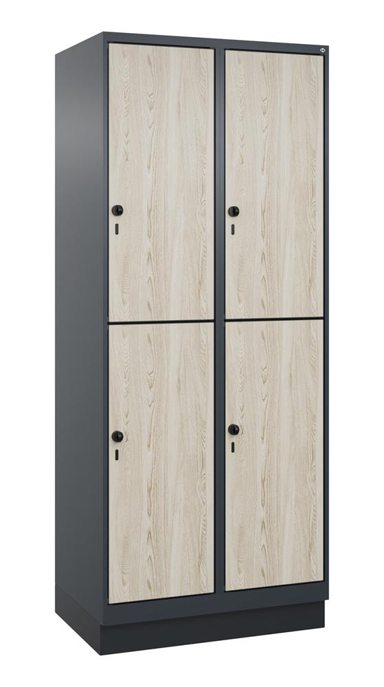 Fächerschrank, doppelstöckig, Sockel, 2x2 Fächer, Abt.B 400 mm, BxTxH 800x500x1950 mm, HPL-Dekorfront, RAL 7016/Dekor Sen Esche
