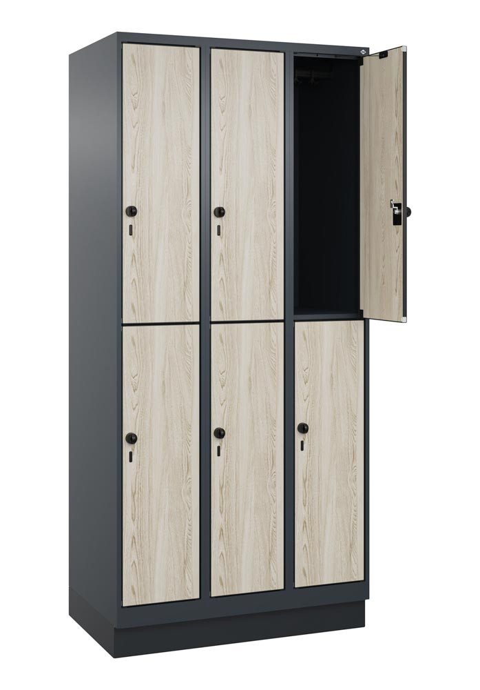 Fächerschrank, doppelstöckig, Sockel, 3x2 Fächer, Abt.B 300 mm, BxTxH 900x500x1950 mm, HPL-Dekorfront, RAL 7016/Dekor Sen Esche