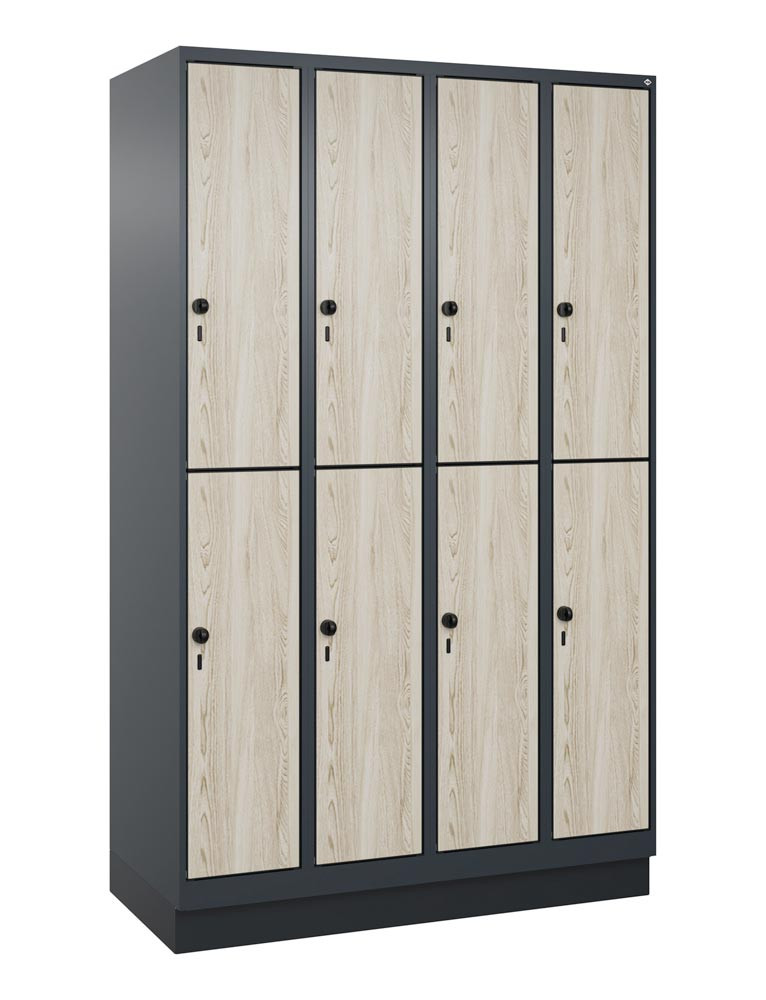 Fächerschrank, doppelstöckig, Sockel, 4x2 Fächer, Abt.B 300 mm, BxTxH 1200x500x1950 mm, HPL-Dekorfront, RAL 7016/Dekor Sen Esche