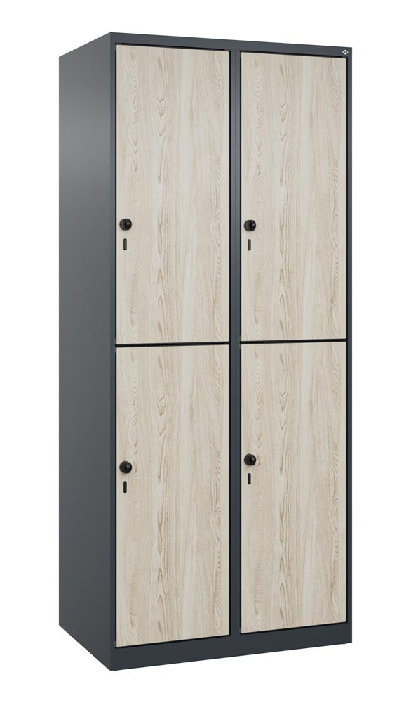 Fächerschrank, doppelstöckig, bodenstehend, 2x2 Fächer, Abt.B 400 mm, BxTxH 800x500x1850 mm, HPL-Dekorfront, RAL 7016/Dekor Sen Esche