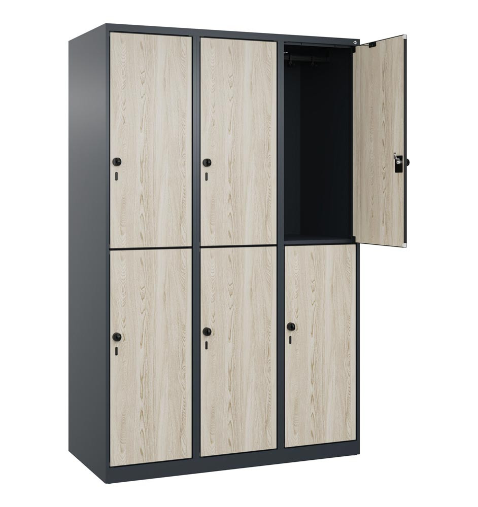 Fächerschrank, doppelstöckig, bodenstehend, 3x2 Fächer, Abt.B 400 mm, BxTxH 1200x500x1850 mm, HPL-Dekorfront, RAL 7016/Dekor Sen Esche