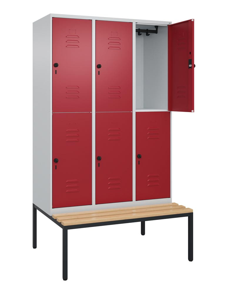 Fächerschrank, untergeb. Sitzbank, BxTxH 1200x500x2120 mm, 3x2 Fächer, Abt.B 400 mm, doppelstöckig, Bucheleisten, Drehriegel, Farbwahl