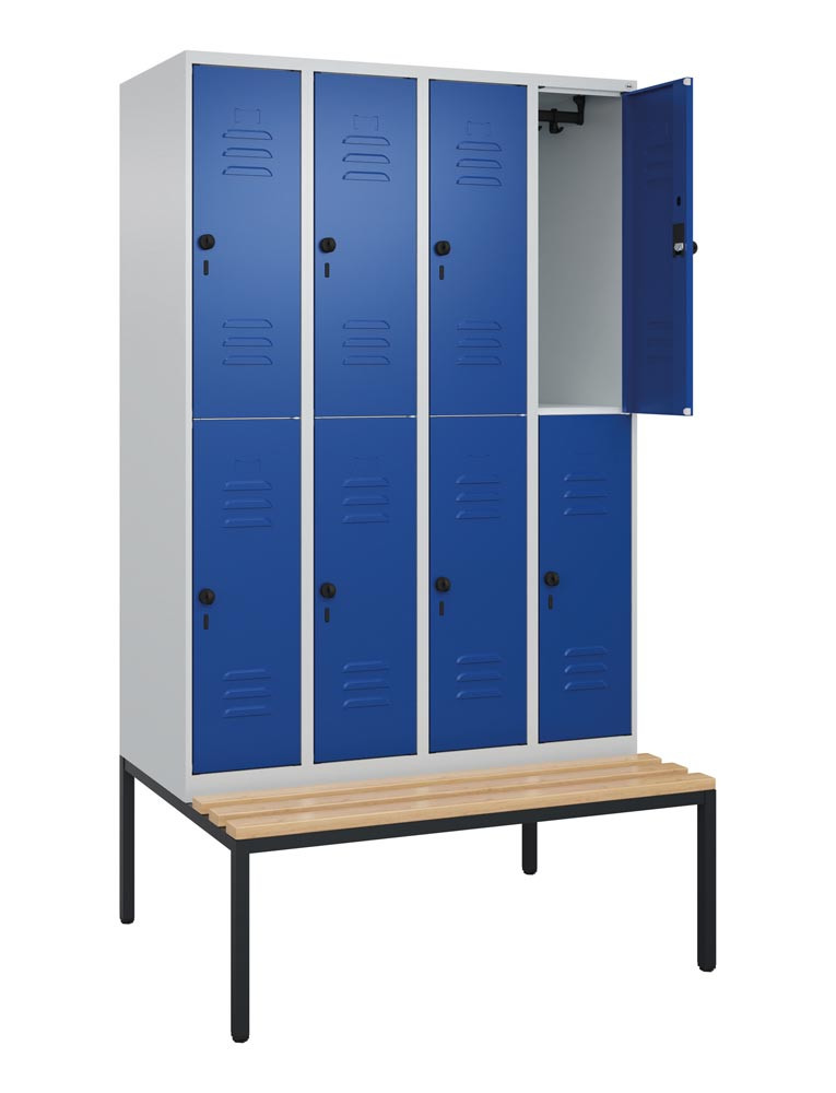 Fächerschrank, untergeb. Sitzbank, BxTxH 1200x500x2120 mm, 4x2 Fächer, Abt.B 300 mm, doppelstöckig, Bucheleisten, Drehriegel, RAL 7035/5010