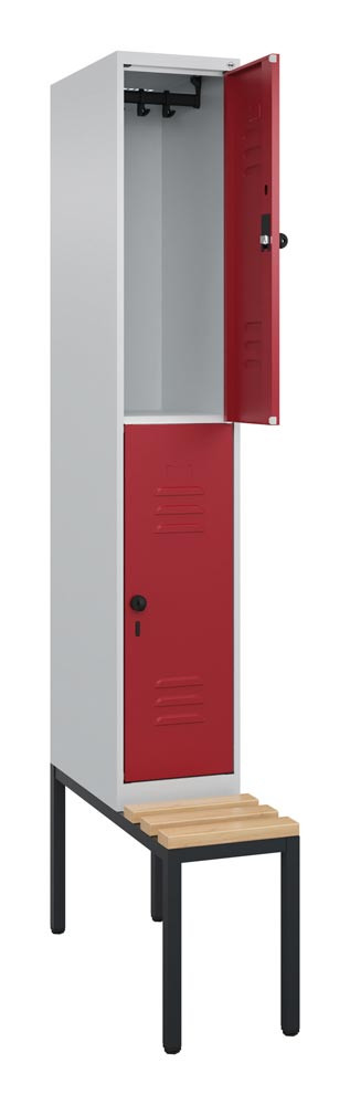 Fächerschrank, untergeb. Sitzbank, BxTxH 300x500x2120 mm, 1x2 Fächer, Abt.B 300 mm, doppelstöckig, Bucheleisten, Drehriegel, Farbwahl
