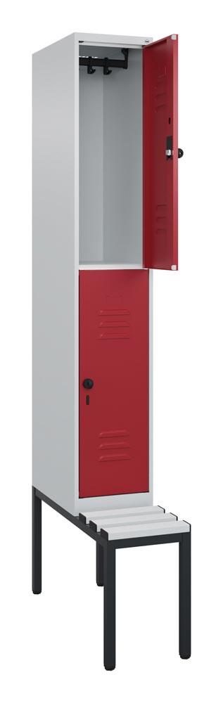 Fächerschrank, untergeb. Sitzbank, BxTxH 300x500x2120 mm, 1x2 Fächer, Abt.B 300 mm, doppelstöckig, Kunststoffleisten, Drehriegel, Farbwahl