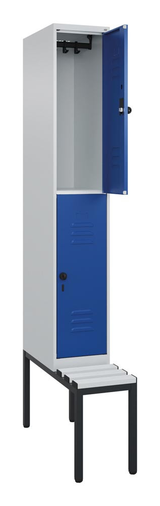 Fächerschrank, untergeb. Sitzbank, BxTxH 300x500x2120 mm, 1x2 Fächer, Abt.B 300 mm, doppelstöckig, Kunststoffleisten, Drehriegel, Farbwahl EP559958