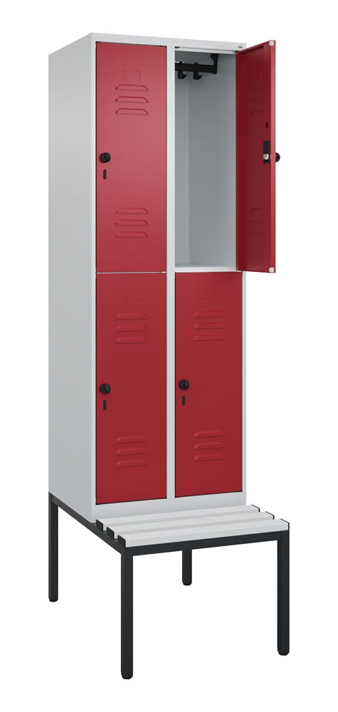 Fächerschrank, untergeb. Sitzbank, BxTxH 600x500x2120 mm, 2x2 Fächer, Abt.B 300 mm, doppelstöckig, Kunststoffleisten, Drehriegel, Farbwahl