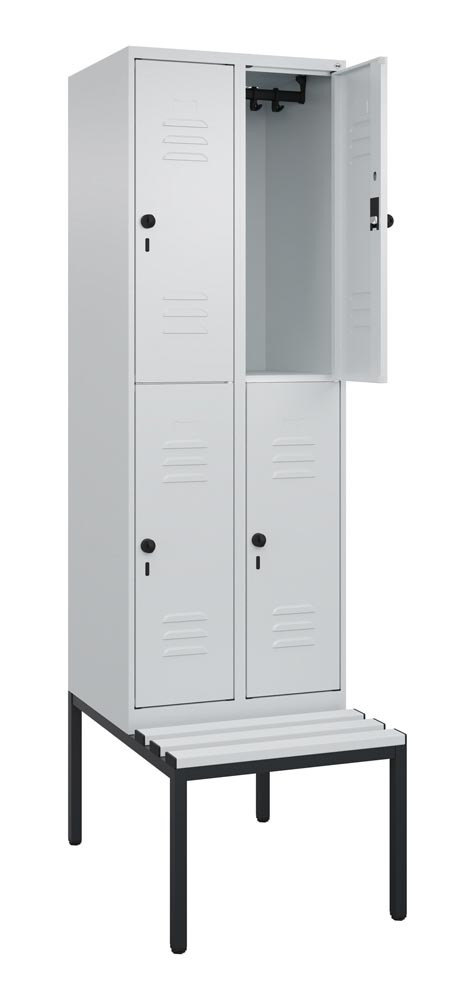 Fächerschrank, untergeb. Sitzbank, BxTxH 600x500x2120 mm, 2x2 Fächer, Abt.B 300 mm, doppelstöckig, Kunststoffleisten, Drehriegel, RAL 7035