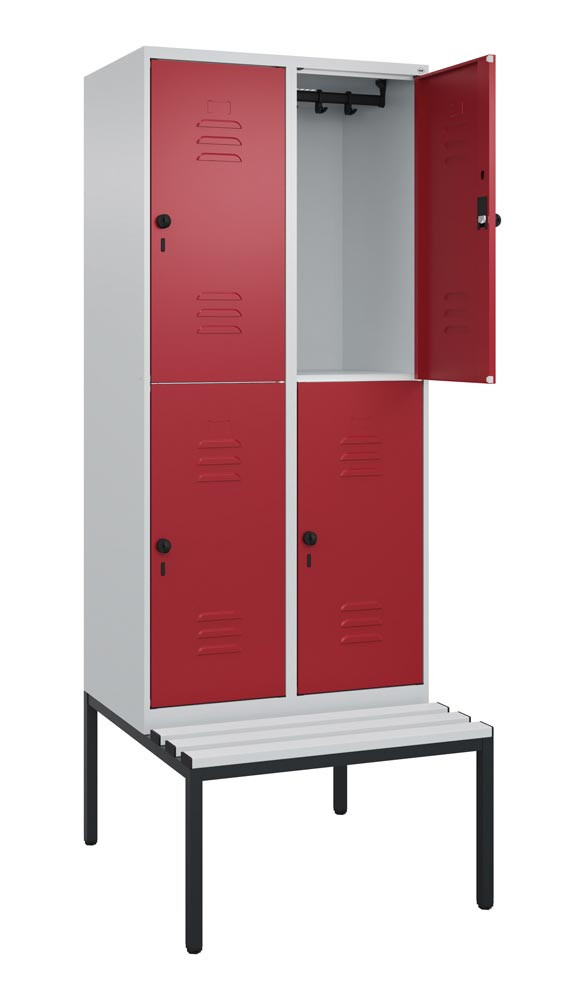 Fächerschrank, untergeb. Sitzbank, BxTxH 800x500x2120 mm, 2x2 Fächer, Abt.B 400 mm, doppelstöckig, Kunststoffleisten, Drehriegel, Farbwahl