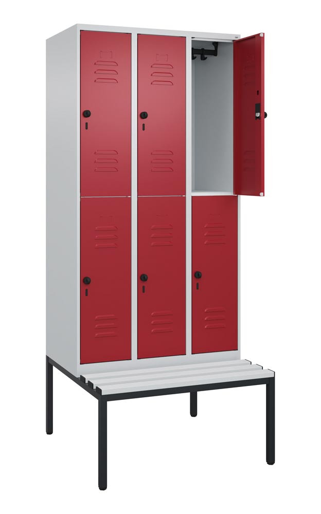 Fächerschrank, untergeb. Sitzbank, BxTxH 900x500x2120 mm, 3x2 Fächer, Abt.B 300 mm, doppelstöckig, Kunststoffleisten, Drehriegel, Farbwahl