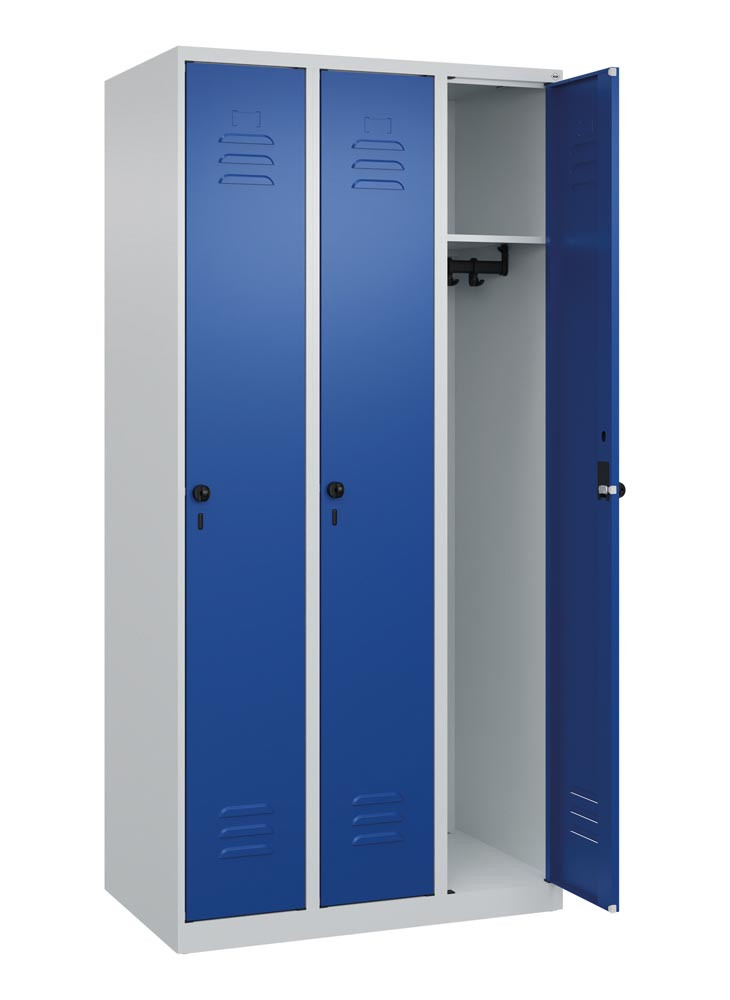 Garderobenschrank, BxTxH 900x500x1850 mm, 3 Abteile, B 300 mm, Bodenstehend, Drehriegel, RAL 7035/5010