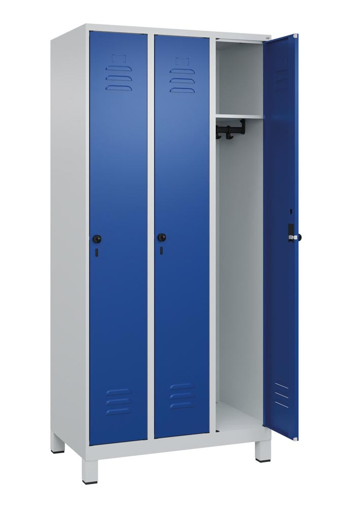 Garderobenschrank, BxTxH 900x500x1950 mm, 3 Abteile, B 300 mm, Füße, Drehriegel, RAL 7035/5010