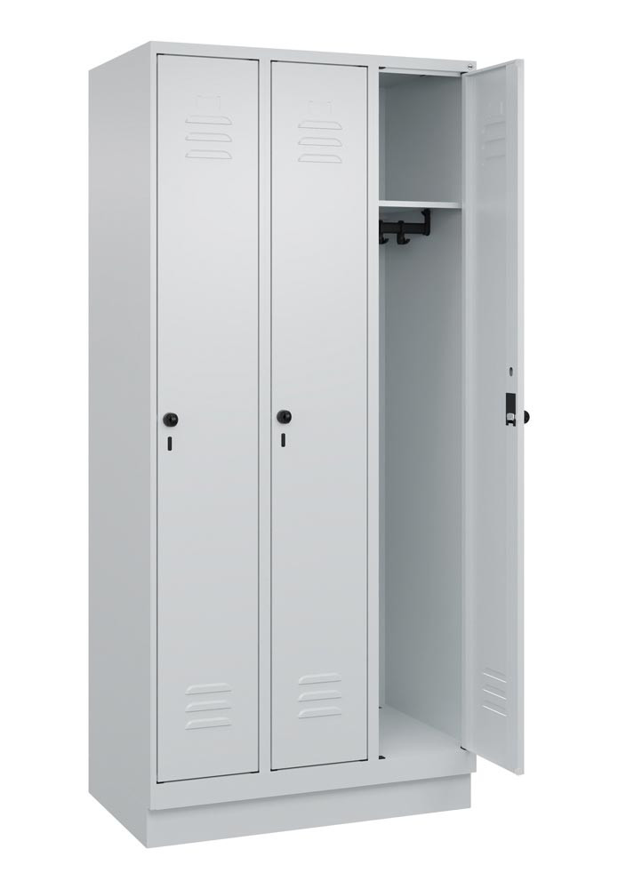Garderobenschrank, BxTxH 900x500x1950 mm, 3 Abteile, B 300 mm, Sockel, Drehriegel, RAL 7035