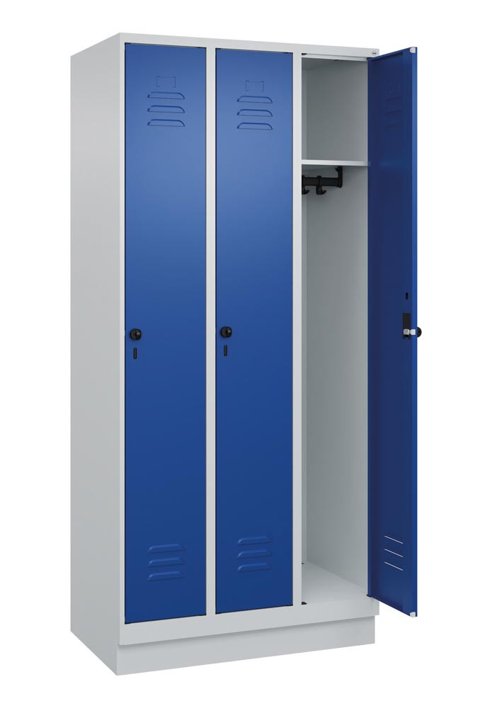 Garderobenschrank, BxTxH 900x500x1950 mm, 3 Abteile, B 300 mm, Sockel, Drehriegel, RAL 7035/5010