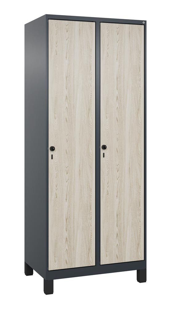 Garderobenschrank, Füße, 2 Abt., Abt.B 400 mm, BxTxH 800x500x1950 mm, HPL-Dekorfront, RAL 7016/Dekor Sen-Esche