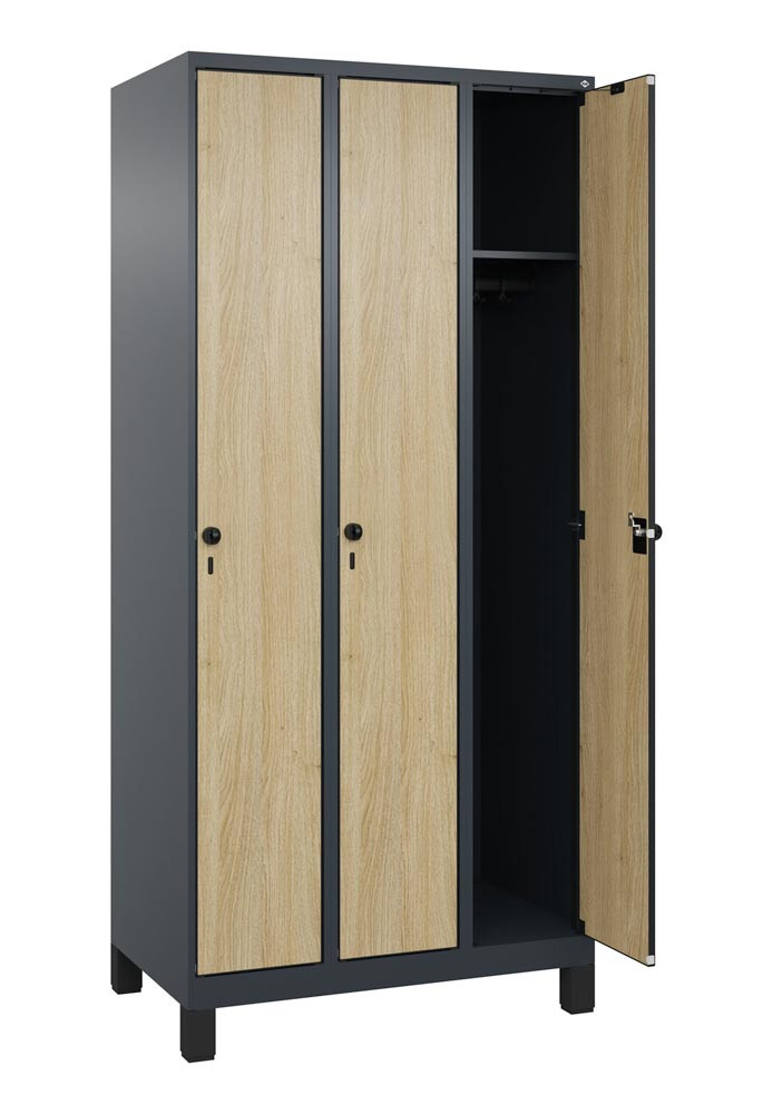Garderobenschrank, Füße, 3 Abt., Abt.B 300 mm, BxTxH 900x500x1950 mm, HPL-Dekorfront, RAL 7016/Dekor Eiche-Sereno