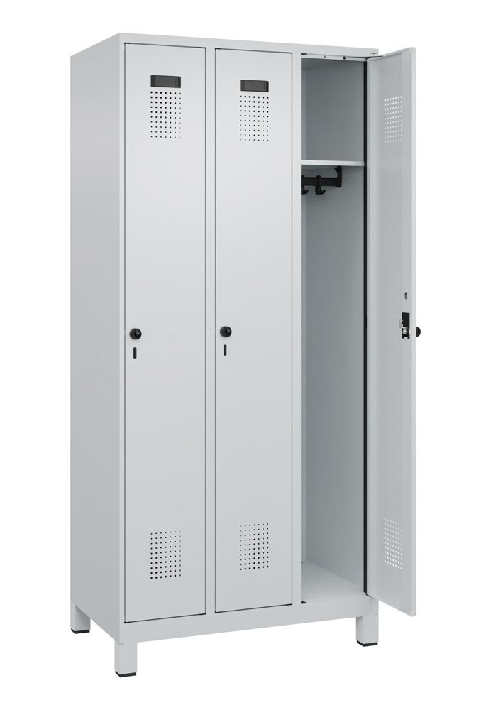 Garderobenschrank, Füße, 3 Abteile, Abt.B 300 mm, Drehriegel, BxTxH 900x500x1950 mm, RAL 7035