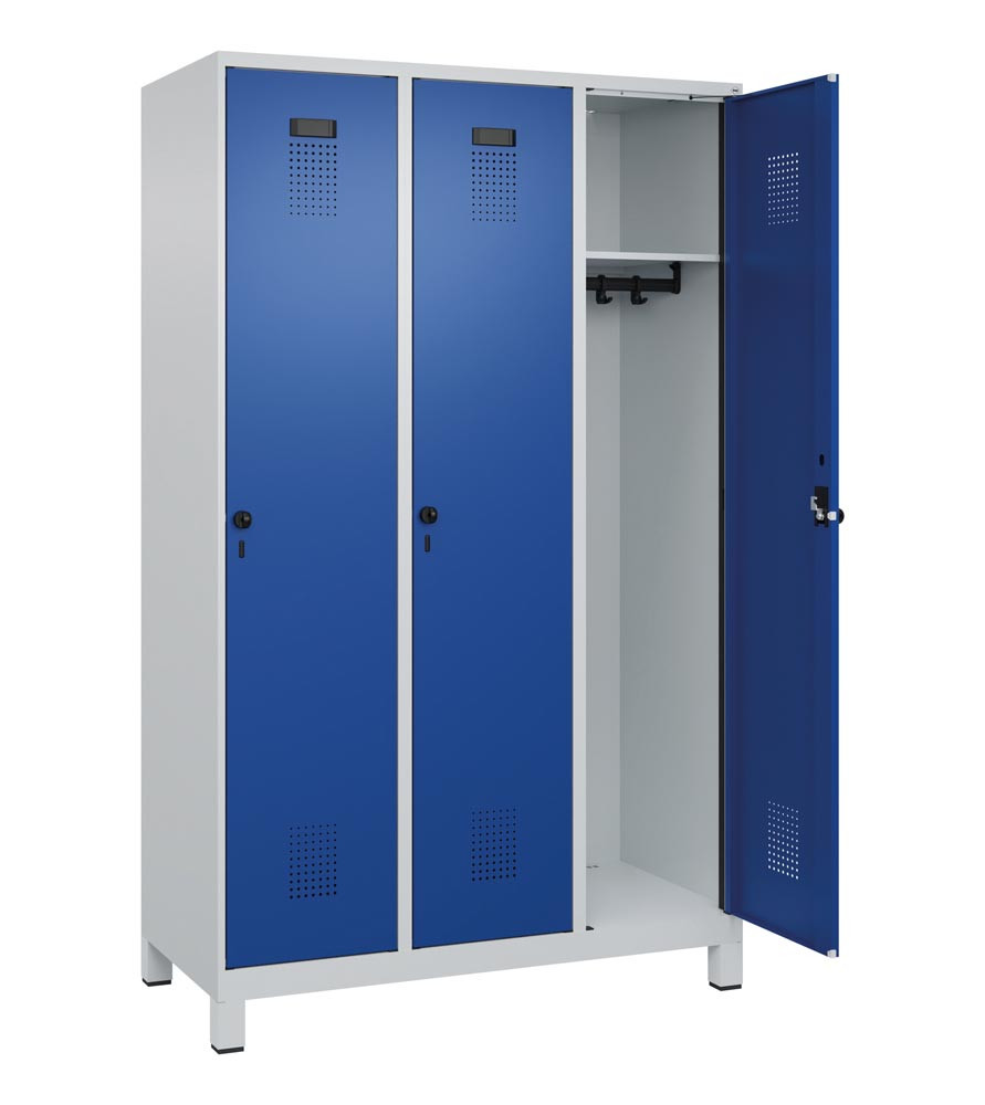 Garderobenschrank, Füße, 3 Abteile, Abt.B 400 mm, Drehriegel, BxTxH 1200x500x1950 mm, RAL 7035/5010