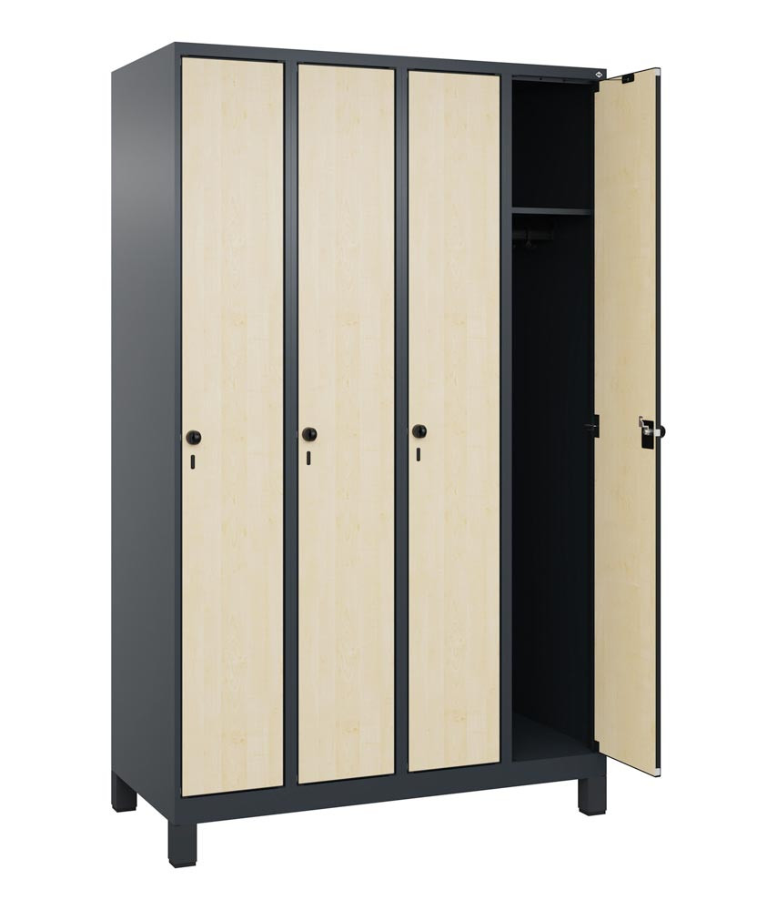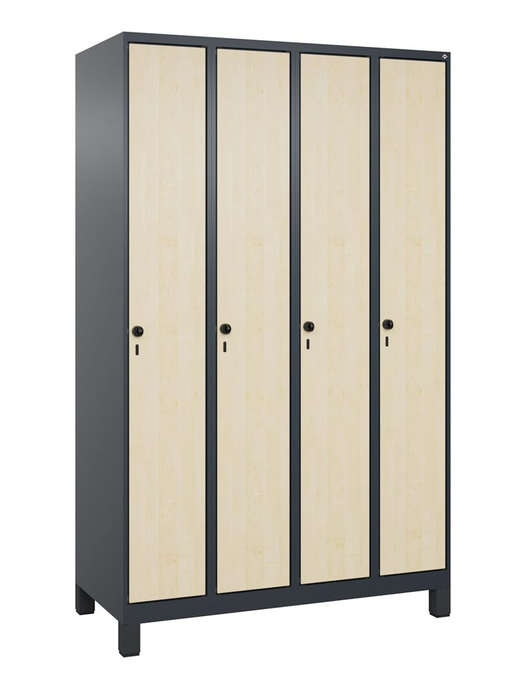 Garderobenschrank, Füße, 4 Abt., Abt.B 300 mm, BxTxH 1200x500x1950 mm, HPL-Dekorfront, RAL 7016/Dekor Ahorn