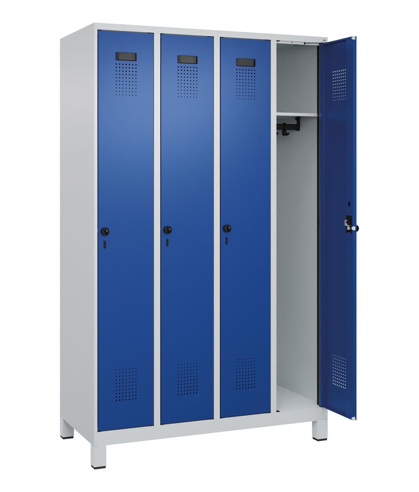 Garderobenschrank, Füße, 4 Abteile, Abt.B 300 mm, Drehriegel, BxTxH 1200x500x1950 mm, RAL 7035/5010