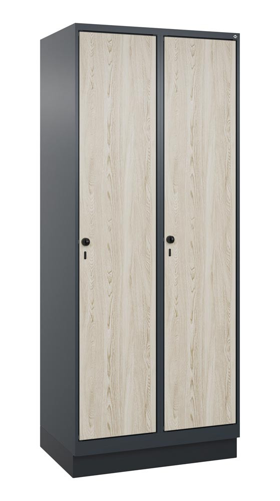 Garderobenschrank, Sockel, 2 Abt., Abt.B 400 mm, BxTxH 800x500x1950 mm, HPL-Dekorfront, RAL 7016/Dekor Sen-Esche
