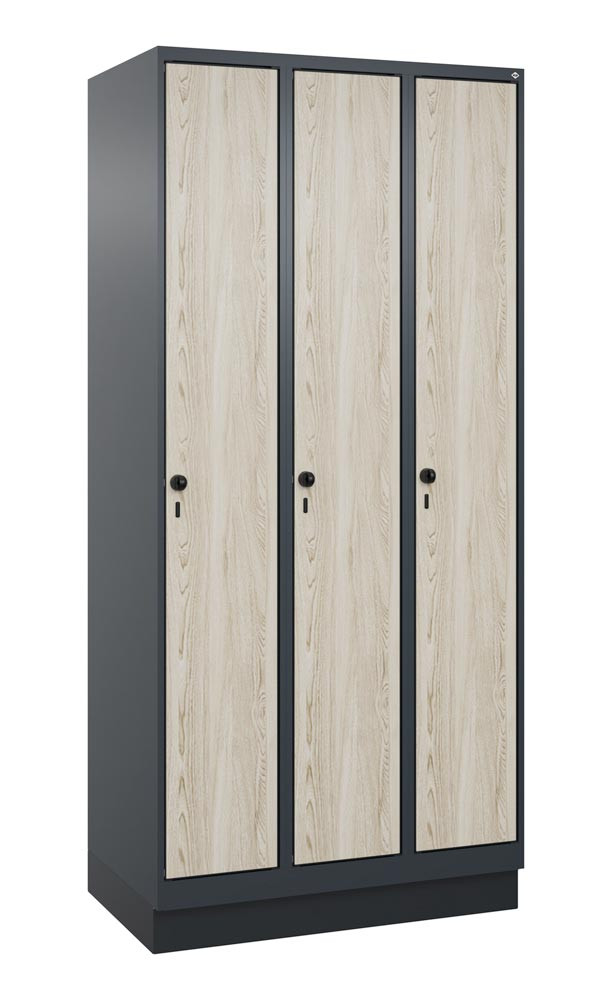 Garderobenschrank, Sockel, 3 Abt., Abt.B 300 mm, BxTxH 900x500x1950 mm, HPL-Dekorfront, RAL 7016/Dekor Sen-Esche