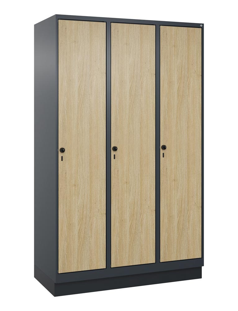 Garderobenschrank, Sockel, 3 Abt., Abt.B 400 mm, BxTxH 1200x500x1950 mm, HPL-Dekorfront, RAL 7016/Dekor Eiche-Sereno