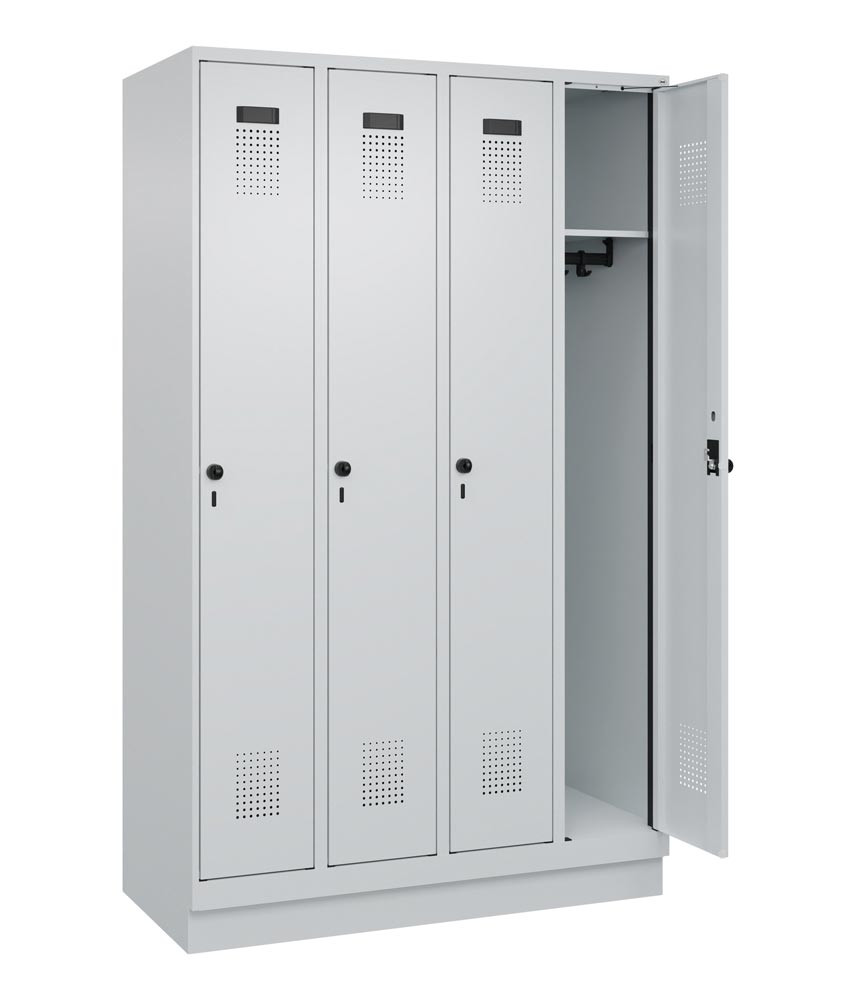 Garderobenschrank, Sockel, 4 Abteile, Abt.B 300 mm, Drehriegel, BxTxH 1200x500x1950 mm, RAL 7035