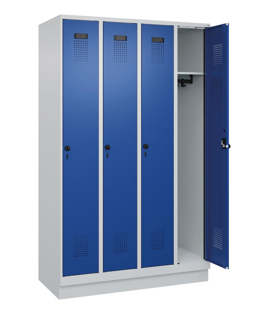 Garderobenschrank, Sockel, 4 Abteile, Abt.B 300 mm, Drehriegel, BxTxH 1200x500x1950 mm, RAL 7035/5010