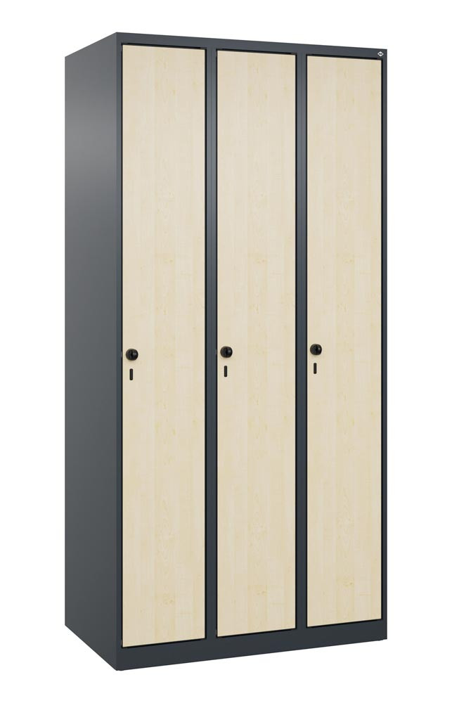 Garderobenschrank, bodenstehend, 3 Abt., Abt.B 300 mm, BxTxH 900x500x1850 mm, HPL-Dekorfront, RAL 7016/Dekor Ahorn