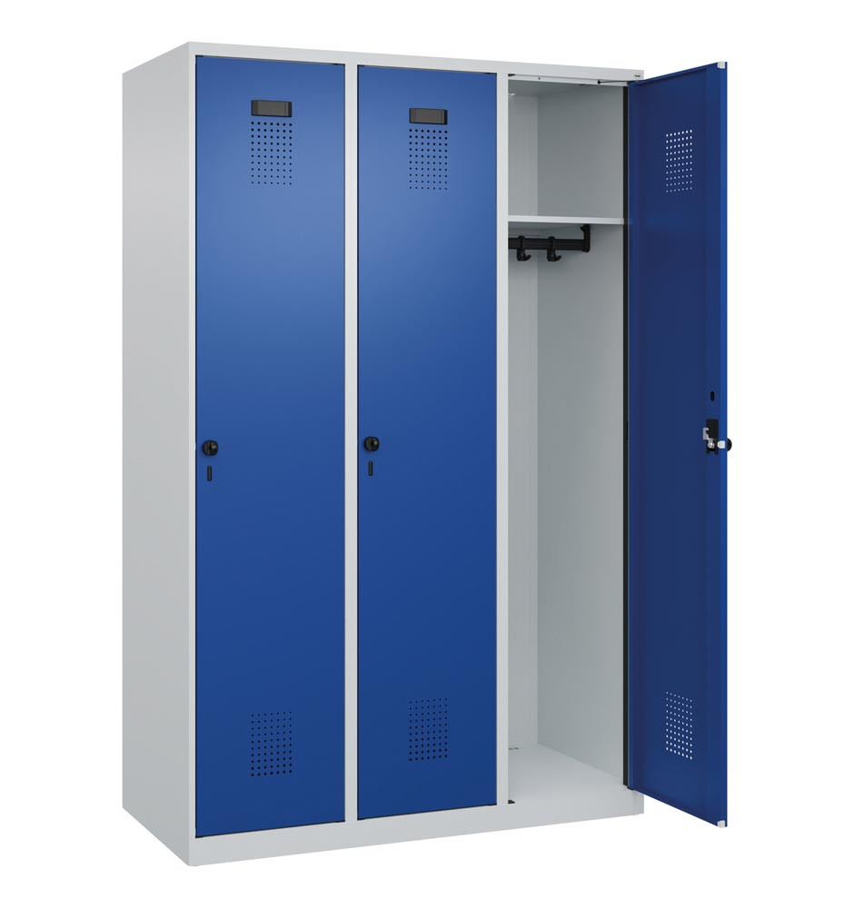 ∙ Stabile Stahlkonstruktion mit hochwertiger Einbrennbeschichtung ∙ Verstärkte Türen mit Anschlagsdämpfer für geräuscharmes Schließen ∙ Designlochbilder für optimale Belüftung ∙ Stabile Garderobenstange mit 3 verdrehsicherem Doppel-Schiebehaken ∙ Glatter Abteilboden für einfaches Auskehren ∙ Fußteil und Schrankboden serienmäßig verzinkt für erhöhten Korrisionschutz ∙ Innovative Kant- und Biege-Geometrien, sowie Materialdopplungen ∙ Fest verschweißter Ablageboden pro Abteil ∙ Optimierte Lüftungsöffnungen im Abteil · Pro Abteil 1 Ablageboden · Korpus T 500 mm · Wahlweise 2-, 3- oder 4 Abteile