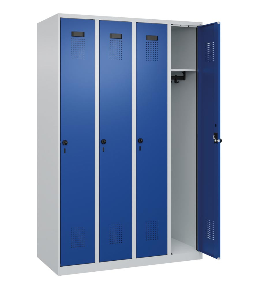 ∙ Stabile Stahlkonstruktion mit hochwertiger Einbrennbeschichtung ∙ Verstärkte Türen mit Anschlagsdämpfer für geräuscharmes Schließen ∙ Designlochbilder für optimale Belüftung ∙ Stabile Garderobenstange mit 3 verdrehsicherem Doppel-Schiebehaken ∙ Glatter Abteilboden für einfaches Auskehren ∙ Fußteil und Schrankboden serienmäßig verzinkt für erhöhten Korrisionschutz ∙ Innovative Kant- und Biege-Geometrien, sowie Materialdopplungen ∙ Fest verschweißter Ablageboden pro Abteil ∙ Optimierte Lüftungsöffnungen im Abteil · Pro Abteil 1 Ablageboden · Korpus T 500 mm · Wahlweise 2-, 3- oder 4 Abteile
