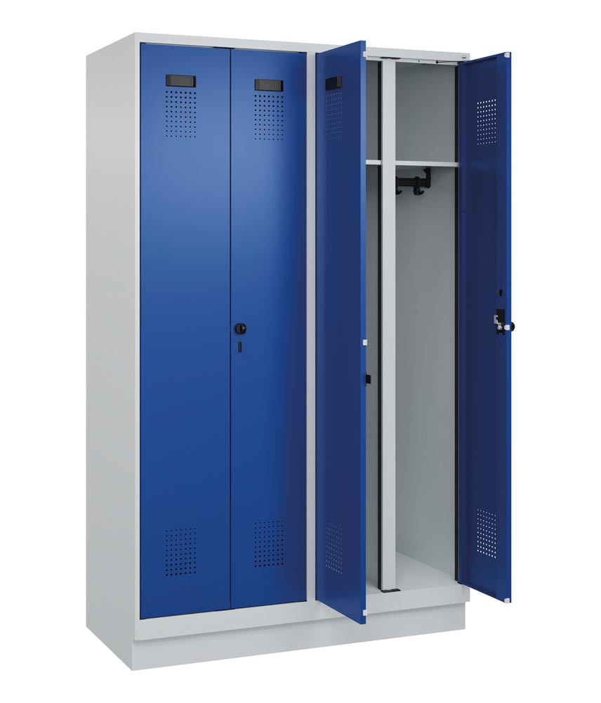 Garderobenschrank, paarw. zuein. schlagende Türen, BxTxH 600x500x1950 mm, 2 Abteile, 1 Nutzer, Abt.B 300 mm, Sockel, Drehriegel, Farbbwahl EP559865
