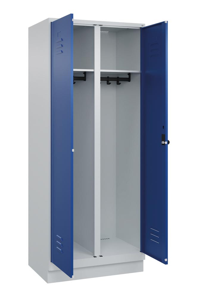 Garderobenschrank, paarw. zuein. schlagende Türen, BxTxH 800x500x1950 mm, 2 Abteile, Abt.B 400 mm, Sockel, Drehriegel, RAL 7035/5010 EP559358